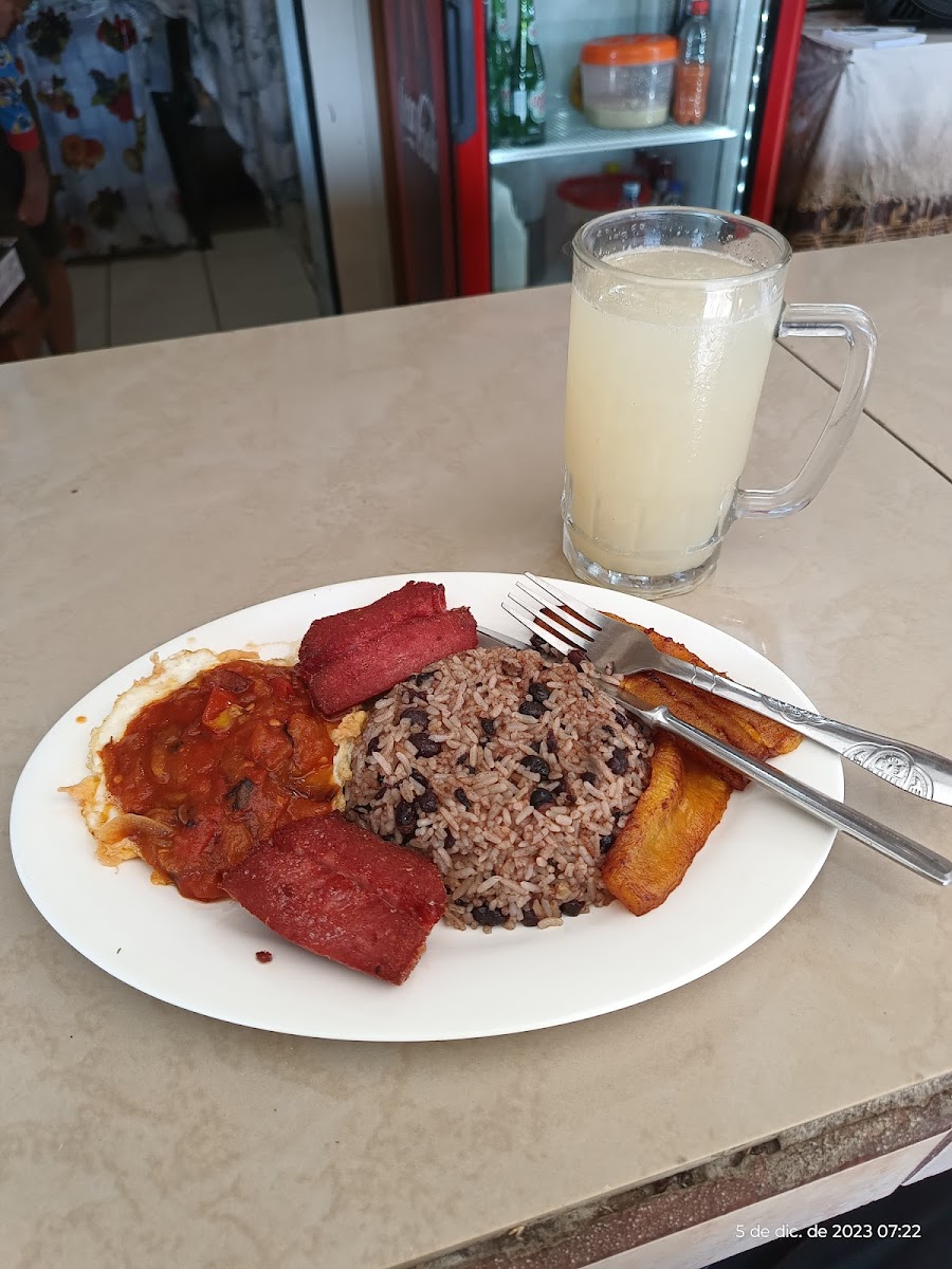 Another favorite that truly represents local taste is the Pinto Con Huevos Rancheros Salchichón Y Platano Con Refresco Natural de Cas. It’s a complete plate, balancing savory flavors with a touch of sweetness from the plantain and the refreshing natural cas drink. Alongside the food, the great coffee served here is a highlight on its own. Whether you stop by early or later in the day, the café-style coffee adds to the overall experience and keeps people lingering a little longer.
